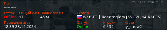 Играет на Counter Strike 1.6 сервере. Страна: РоссияПервый раз замечен 23:46 27.04.2024