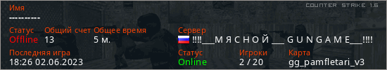Играет на Counter Strike 1.6 сервере. Страна: РоссияПервый раз замечен 18:24 02.06.2023