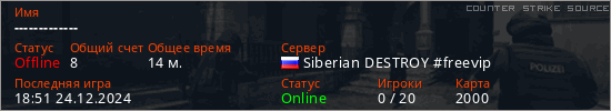 Играет на Counter Strike Source сервере. Страна: РоссияПервый раз замечен 23:47 22.12.2024