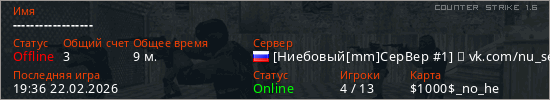 Играет на Counter Strike 1.6 сервере. Страна: РоссияПервый раз замечен 18:42 11.02.2026