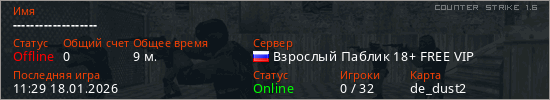 Играет на Counter Strike 1.6 сервере. Страна: РоссияПервый раз замечен 17:41 31.12.2025