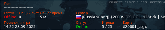 Играет на Counter Strike Global Offensive сервере. Страна: РоссияПервый раз замечен 14:07 28.09.2025