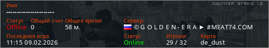 Играет на Counter Strike 1.6 сервере. Страна: РоссияПервый раз замечен 10:19 09.02.2026