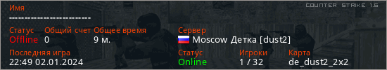 Играет на Counter Strike 1.6 сервере. Страна: РоссияПервый раз замечен 04:21 02.10.2023