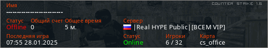Играет на Counter Strike 1.6 сервере. Страна: РоссияПервый раз замечен 07:51 28.01.2025
