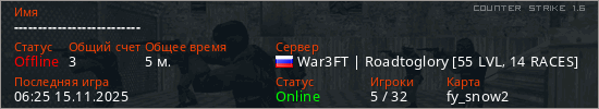 Играет на Counter Strike 1.6 сервере. Страна: РоссияПервый раз замечен 06:10 15.11.2025