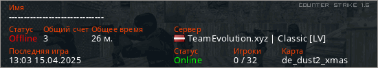 Играет на Counter Strike 1.6 сервере. Страна: ЛатвияПервый раз замечен 13:02 12.04.2025