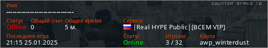 Играет на Counter Strike 1.6 сервере. Страна: РоссияПервый раз замечен 20:56 25.01.2025