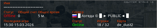 Играет на Counter Strike 1.6 сервере. Страна: РоссияПервый раз замечен 15:18 15.03.2026