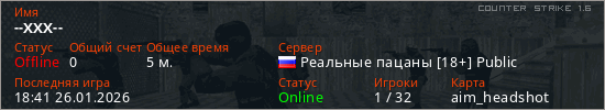 Играет на Counter Strike 1.6 сервере. Страна: РоссияПервый раз замечен 18:35 26.01.2026