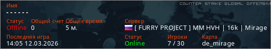 Играет на Counter Strike Global Offensive сервере. Страна: РоссияПервый раз замечен 13:59 12.03.2026