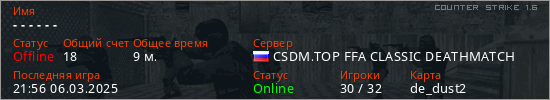 Играет на Counter Strike 1.6 сервере. Страна: РоссияПервый раз замечен 11:24 21.02.2025