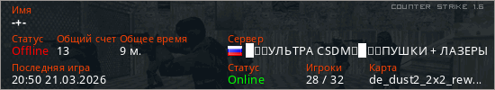 Играет на Counter Strike 1.6 сервере. Страна: РоссияПервый раз замечен 20:14 21.03.2026