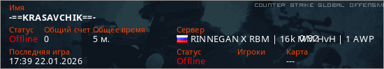 Играет на Counter Strike Global Offensive сервере. Страна: РоссияПервый раз замечен 17:37 22.01.2026