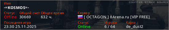 Играет на Counter Strike Source сервере. Страна: РоссияПервый раз замечен 13:33 19.07.2021