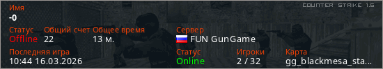 Играет на Counter Strike 1.6 сервере. Страна: РоссияПервый раз замечен 08:57 27.02.2026