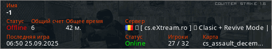 Играет на Counter Strike 1.6 сервере. Страна: РумынияПервый раз замечен 20:45 22.10.2024