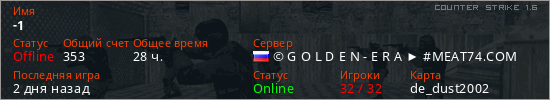 Играет на Counter Strike 1.6 сервере. Страна: РоссияПервый раз замечен 21:27 15.01.2023