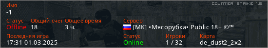 Последний раз был в сети 17:31 01.03.2025 Игрок с таким ником замечен на 51 сервере