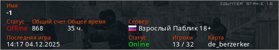 Играет на Counter Strike 1.6 сервере. Страна: РоссияПервый раз замечен 16:03 26.10.2019