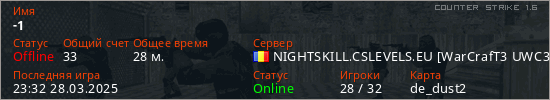 Последний раз был в сети 23:32 28.03.2025 Игрок с таким ником замечен на 51 сервере