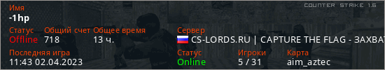 Играет на Counter Strike 1.6 сервере. Страна: РоссияПервый раз замечен 11:37 10.07.2021
