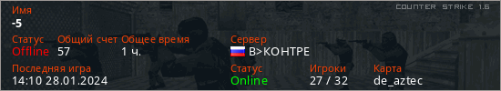 Играет на Counter Strike 1.6 сервере. Страна: РоссияПервый раз замечен 12:00 21.12.2020