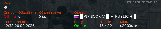 Играет на Counter Strike 1.6 сервере. Страна: РоссияПервый раз замечен 12:30 08.02.2026