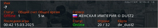 Играет на Counter Strike 1.6 сервере. Страна: РоссияПервый раз замечен 00:38 15.03.2025