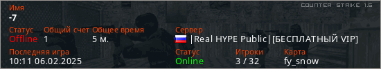Играет на Counter Strike 1.6 сервере. Страна: РоссияПервый раз замечен 09:59 06.02.2025