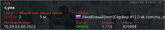 Играет на Counter Strike 1.6 сервере. Страна: РоссияПервый раз замечен 15:27 03.08.2023
