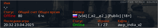 Играет на Counter Strike Source сервере. Страна: РоссияПервый раз замечен 23:15 17.12.2023