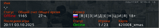 Играет на Counter Strike 1.6 сервере. Страна: РоссияПервый раз замечен 13:22 09.03.2019