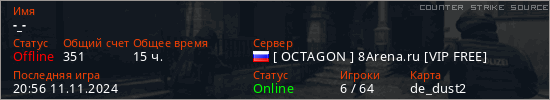 Играет на Counter Strike Source сервере. Страна: РоссияПервый раз замечен 10:08 20.02.2020