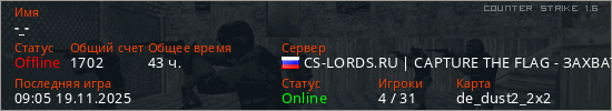 Играет на Counter Strike 1.6 сервере. Страна: РоссияПервый раз замечен 10:07 18.02.2021