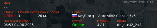 Играет на Counter Strike 1.6 сервере. Страна: РоссияПервый раз замечен 07:22 25.10.2024