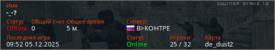 Играет на Counter Strike 1.6 сервере. Страна: РоссияПервый раз замечен 08:57 05.12.2025