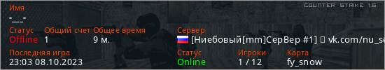 Играет на Counter Strike 1.6 сервере. Страна: РоссияПервый раз замечен 17:31 02.09.2023