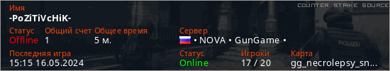 Играет на Counter Strike Source сервере. Страна: РоссияПервый раз замечен 15:03 16.05.2024