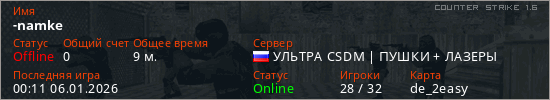 Играет на Counter Strike 1.6 сервере. Страна: РоссияПервый раз замечен 19:26 05.01.2026