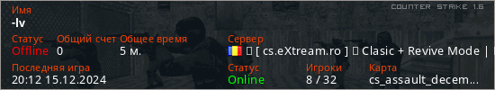 Играет на Counter Strike 1.6 сервере. Страна: РумынияПервый раз замечен 20:10 15.12.2024