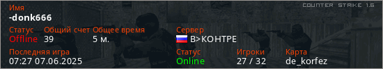 Играет на Counter Strike 1.6 сервере. Страна: РоссияПервый раз замечен 07:21 07.06.2025