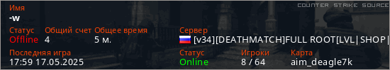 Играет на Counter Strike Source сервере. Страна: РоссияПервый раз замечен 17:53 17.05.2025