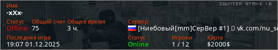 Играет на Counter Strike 1.6 сервере. Страна: РоссияПервый раз замечен 10:27 12.11.2023