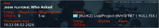 Играет на Counter Strike Global Offensive сервере. Страна: КазахстанПервый раз замечен 10:17 08.02.2026