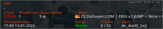 Играет на Counter Strike 1.6 сервере. Страна: ГерманияПервый раз замечен 17:30 13.01.2026