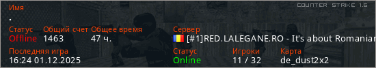 Играет на Counter Strike 1.6 сервере. Страна: РумынияПервый раз замечен 20:30 10.05.2022