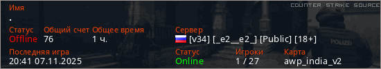 Играет на Counter Strike Source сервере. Страна: РоссияПервый раз замечен 20:12 16.11.2023