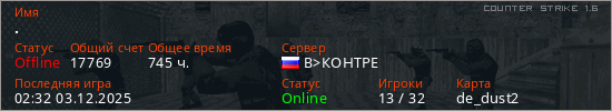 Играет на Counter Strike 1.6 сервере. Страна: РоссияПервый раз замечен 06:47 09.11.2019