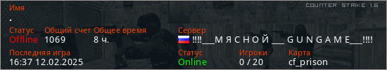 Играет на Counter Strike 1.6 сервере. Страна: РоссияПервый раз замечен 14:24 18.01.2022